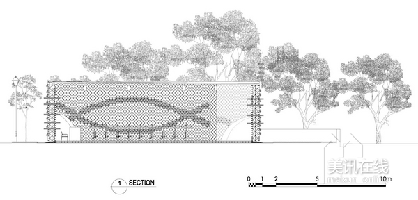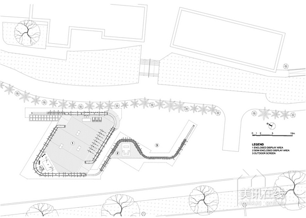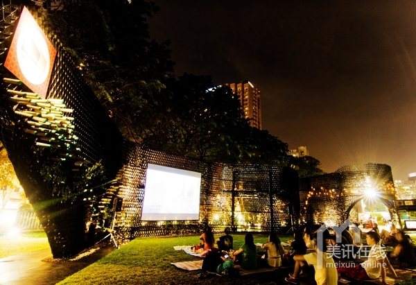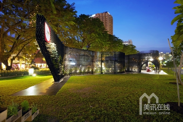 活動的實施;另一方面,亭閣外圍設計了兩個外層表面,波紋狀的墻面設計非常吸引人眼球,是一道非常亮麗的景觀設計。