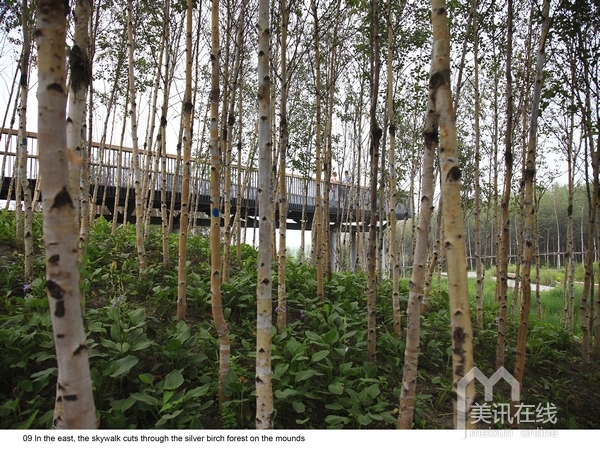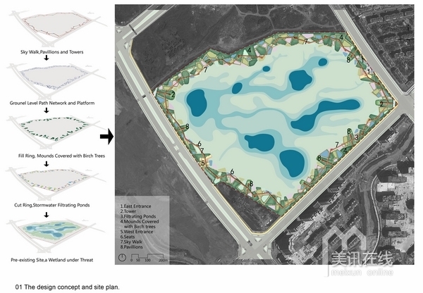 設計策略是保留場地中部的大部分區域作為自然演替區,沿四周通過挖填方的平衡技術,創造出一系列深淺不一的水坑和高地不一的土丘,成為一條藍-綠項鏈,形成自然與城市之間的一層過濾膜和體驗界面。沿四周布置雨水進水管,收集城市雨水,使其經過水泡系統經沉淀和過濾后進入核心區的自然濕地山丘上密植白樺林,水泡中為鄉土水生和濕生植物群落。高架棧橋連接山丘,布道網絡穿越于丘林。水泡中設臨水平臺,丘林上有觀光亭塔之類。創造豐富多樣的體驗空間。