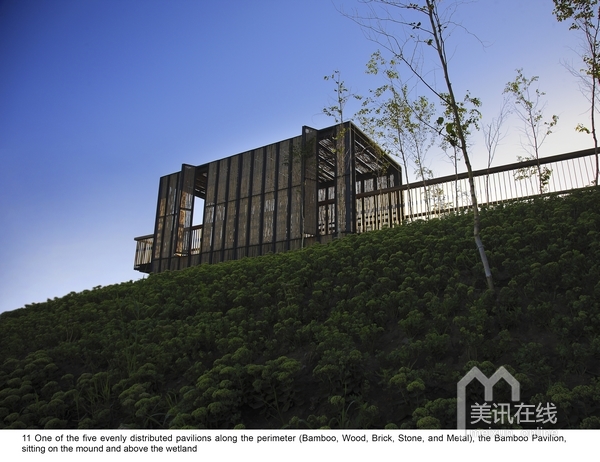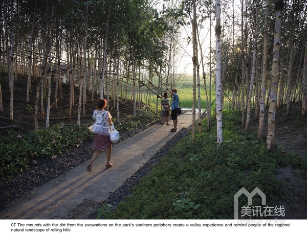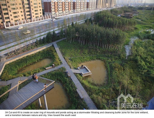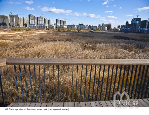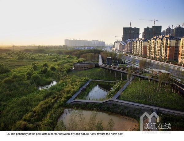 2009年中,受當地政府委托,北京土人景觀與建筑規劃設計研究院,承擔了群力新區的一個主要公園設計。公園占地34公頃,為城市的一個綠心。場地原為濕地,但由于周邊的道路建設和高密度城市的發展,導致該濕地面臨水源枯竭,濕地退化,并將消失的危險。土人的策略是將該面臨消失的濕地轉化為雨洪公園,一方面解決新區雨洪的排放和滯留,使城市免受澇災威脅,同時,利用城市雨洪,恢復濕地系統,營造出具有多種生態服務的城市生態基礎設施。實踐證明,設計獲得了巨大成功,實現了設計的意圖。