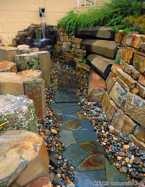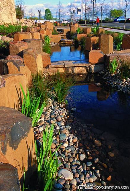 你也許會問,藝術在哪里?雨水打造的水體景觀的建筑表達方式是什么?優秀的設計能否將雨水利用和運用雨水本身所形成的融合建筑體驗的“場所創造”聯系在一起?答案是肯定的。一些富有創造力的景觀設計師已經發現雨水所蘊含的藝術潛能。就像我上面說的一樣,關鍵是表達出雨水在整個設計中的獨特動感之美。景觀設計師史蒂夫·科赫為波特蘭的一座公寓設計的庭院景觀就是一個典范。科赫的設計將屋頂雨水收集起來,水流在高低錯落的水道中歡快地跳躍著,最后注入巖石圍筑的水池。水池下是一個用于收集雨水的蓄水池。值得注意的是科赫的這個成功作品還借鑒了印度傳統的建筑圖騰。景觀設計師在利用雨水打造水體景觀時,要充分學習當地傳統文化,將其有效地運用到設計中。