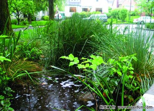 一項日益盛行的利用雨水打造水體景觀的重要創新之舉就是采用“綠色街道”。所謂“綠色街道”就是通過入滲池、雨水花園以及街道與人行道之間常有的淺溝來收集雨水。就像本文所提到的其他景觀設施一樣,“綠色街道”同樣也有效地減輕了市政排水系統的壓力。波特蘭已將這種功能性的“綠色街道”作為城市正在實施的示范項目。一般來說,“綠色街道”設在現有城市肌理的隱蔽處或縫隙處,如學校周圍、停車場、林蔭大道、雜貨店入口或住宅區的停車位。它們仿佛是現代城市中冰冷堅硬的街道及停車場中的“星星之火”,為城市搭建起一條處理城市雨水的生態體系。在典型的“綠色街道”中,雨水在排水溝中流經整條街道,最后注入一系列種有植被的洼地,雨水在這里經植物凈化滲入土壤。降水量大的時候,多余的雨水則排入傳統的城市排水系統中。