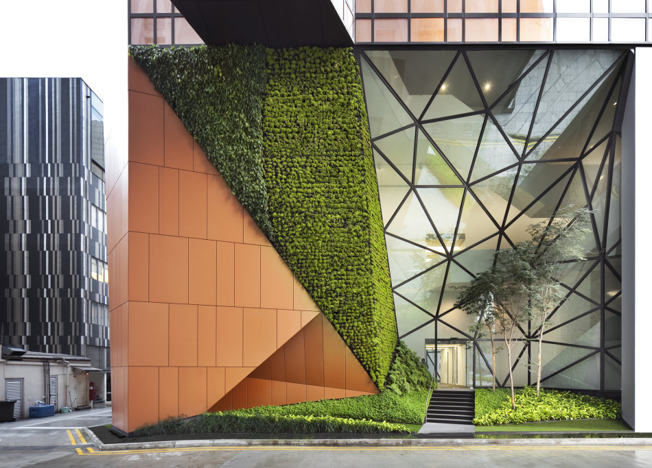 As the original floor levels with their low ceiling heights were retained, the front end of the shophouses was deemed more suitable for meeting rooms, while the service end accommodated a mechanised carpark. The idea was to strategically lift up the open plan offices within the upper 4 floors where the floor plate size is maximised, higher headroom is gained, better views are enjoyed and more natural daylight is accessed from the sides. Every flat roof area is also transformed into roof gardens with the attic featuring the office’s recreational lounge from which unblocked panoramic views of Hong Lim Park and PARKROYAL on Pickering Hotel can be enjoyed.