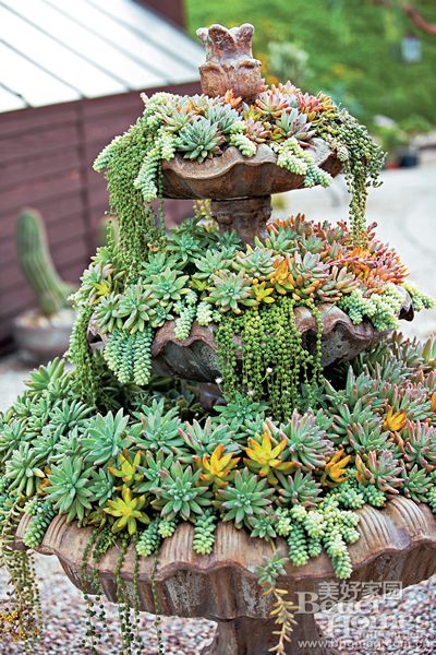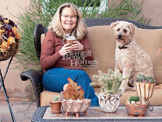 Jeanne也喜歡自己組多肉植物盆栽,常用到的素材是墨西哥景天,比如新玉綴、金色的銘月,它們的葉片只有子彈大小,但是沒有它們的歐洲替代品種那么耐寒。通常,這些歐洲的替代品種的葉片會更袖珍。在有花園聚會或朋友到訪的時候,Barry會開著車接送客人駛過花園中悠長而陡峭的車道,沿途人們看到他們豐盛的多肉植物花園,第一反應就是回去自己也要設計一個同樣的花園,鏟除原來花園里的草坪,甚至還有些朋友強烈要求下次帶自己的花園設計師過來取經。這個用多肉植物和仙人掌組成的低水需花園已經是周圍人紛紛效仿的典范。