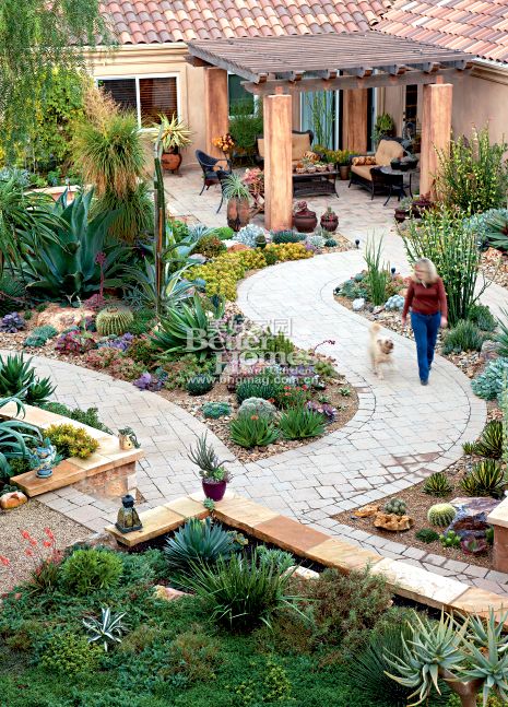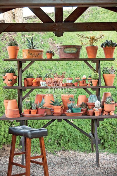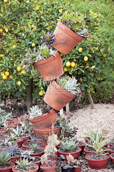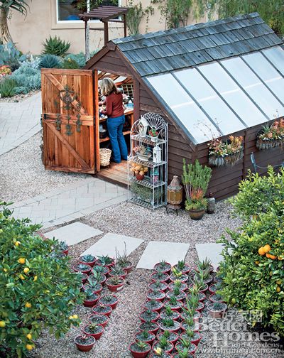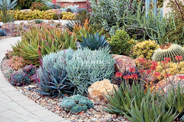 花園工具房里存放著整碗的彩色碎玻璃,它們是Jeanne用來裝飾盆栽的,透過天窗的光線閃閃發光。附近的小木屋則用來庇護她的植物和繁殖新的幼苗,根據季節Jeanne會從高抬花床收獲到沙拉菜、番茄、南瓜、草莓和十幾種香草。夏天,她喜歡用綠薄荷的葉和冰水調制飲料。盡管蔬菜花園里的作物看起來與外邊的多肉植物、仙人掌風格相差甚遠,但它們的位置集中在幾處島狀的區域,通過的重復景觀的手法,讓它們看起來不那么突兀。從視覺的角度說,也促進了房子與花園中黃褐色的灰泥矮墻之間的協調問題。雖然花園的設計是以耐干旱為主題,這并不意味著花園沒有完善的灌溉系統。畢竟南加利福尼亞州有時會出現幾個月無降雨的情況,此時就需要灌溉系統登場。多肉植物雖不像養護草坪、玫瑰或一年生植物那樣費水,但常規的給水會讓它們有最出色的表現。